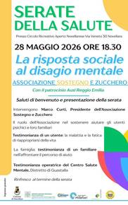 GIOVEDI 28 MAGGIO 2026 ORE 18.00 c/o Circolo Ricreativo Aperto Novellarese “La risposta sociale al Disagio mentale” Associazione Sostegno e Zucchero, interviene il Presidente Marco Curti oltre ad alcune testimonianze.